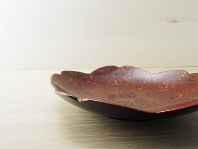 地色の赤に緑と赤の彩色を施した菓子皿です。 お菓子皿として和菓子、洋菓子を乗せてもいいです、又お惣菜を乗せてもいいです。 素材が樹脂で出来ているので取り扱いも簡単です。 サイズ:直径16cm…