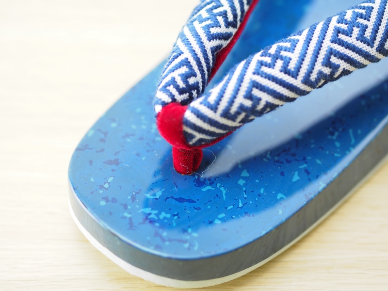 地色の青に白の彩色を施した下駄に夏次郎商店さんの鼻緒を付けた下駄です。