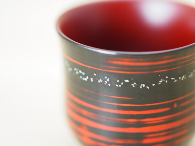 静かな水面に走る風の足跡のような静寂塗(しじまぬり)を施し、持ち手部分には光に当たるとキラキラと光る微塵貝を散りばめています。